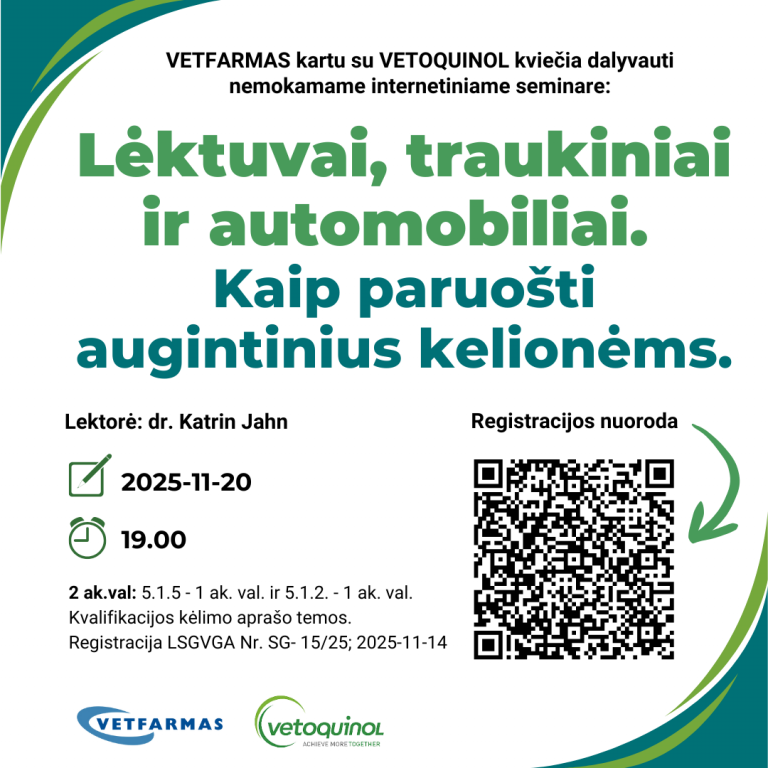 Vet. gydytojams suteikiamos 2 val., kurios atitinka 5.1.5 – 1 ak. val. ir 5.1.2. – 1 ak. val. kvalifikacijos kėlimo aprašo temas. Registracija LSGVGA Nr. SG- 15/25; 2025-11-14