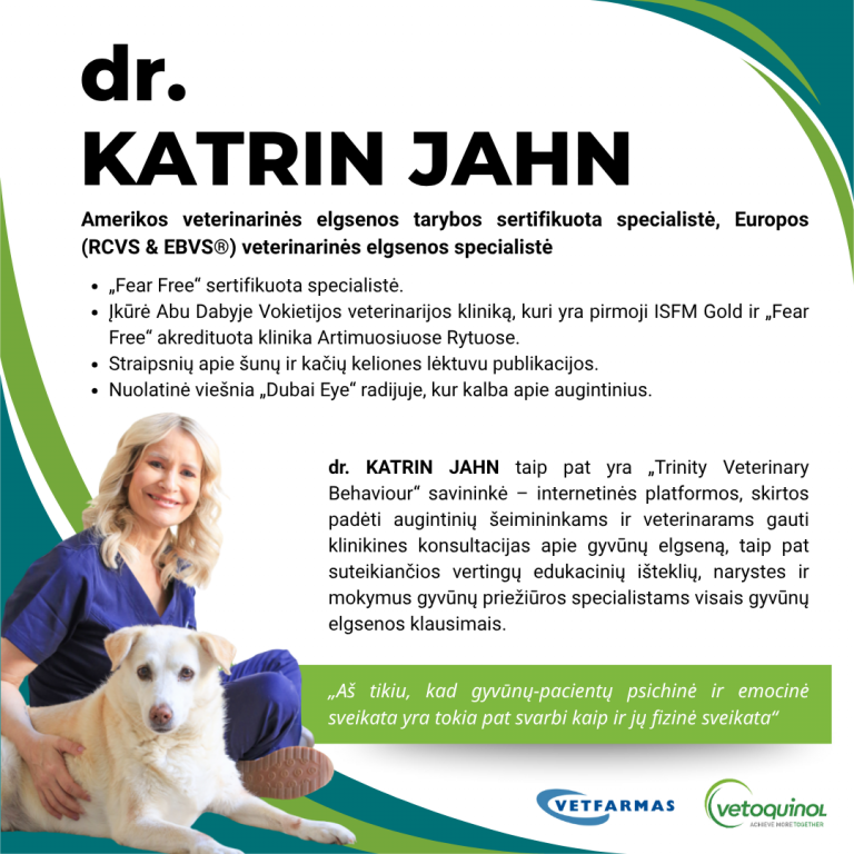 Internetiniame seminare dr. Katrin Jahn aptars, kaip užtikrinti, kad kelionės su augintiniais būtų kuo ramesnės ir saugesnės tiek gyvūnams, tiek jų šeimininkams. Lektorė paaiškins, kokie veiksniai kelia stresą gyvūnams kelionės metu ir kokių priemonių galima imtis, kad būtų sumažintas nerimas bei elgesio problemų rizika. Bus aptartos praktinės rekomendacijos dėl transportavimo dėžių, pasiruošimo skrydžiui, vaistų naudojimo prieš keliones bei augintinių adaptacijos naujoje aplinkoje. Taip pat pristatomi „Fear Free“ metodai, padedantys keliones paversti teigiama patirtimi tiek šunims, tiek katėms.